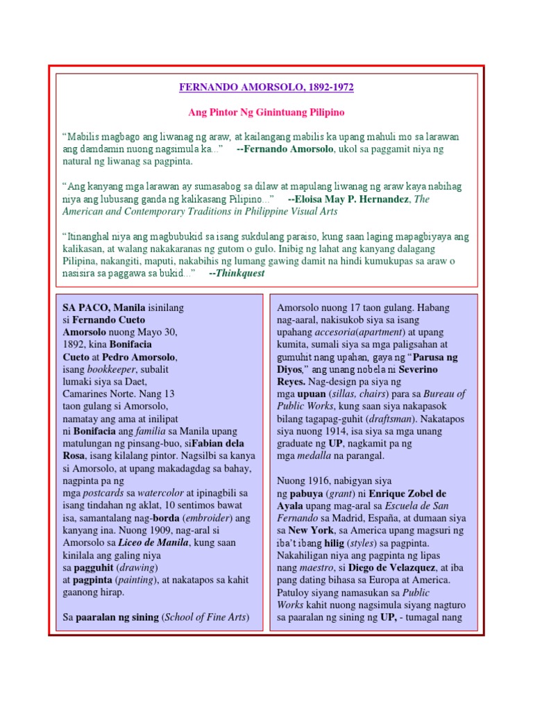 Siya ang tinaguriang father of modern philippines painting. Ang mga manggagawa ang ginamit niyang tema upang mabigyang pansin ang sakripisyo na dinaranas ng mga ito. 3 question 19. Siya ang tinaguriang Father of Modern Philippine Painting ang kayang istilo sa pagpinta ay taliwas sa istilo ni Amorsolo.