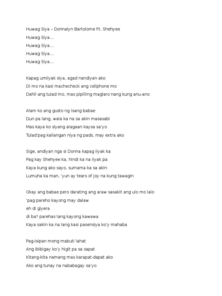 Here is the Lyrics of Huwag Siya. 22072017 Lyrics for Pag Siya by Donnalyn Bartolome. Shehyee have been translated into 2 languages.