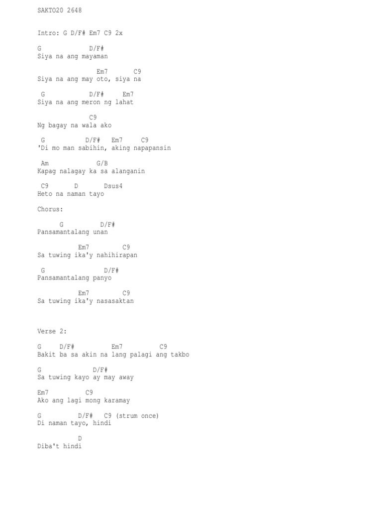 31102018 Intro G DF Em7 C9 G DF Em7 C9 Verse 1 G DF Siya na ang mayaman Em7 C9 Siya na ang may oto siya na G DF Em7 Siya na ang meron ng lahat C9 Ng bagay na wala ako G DF Em7 C9 Di mo man sabihin aking napapansin Am GB Kapag nalagay ka sa alanganin C9 D Dsus4 Heto na naman tayo Chorus G DF Pansamantalang unan Em7 C9 Sa tuwing ikay nahihirapan G DF Pansamantalang panyo Em7 C9 Sa tuwing ikay nasasaktan Verse 2 G DF Em7 C9 Bakit ba. Tablatures and chords for acoustic guitar and electric guitar. Written by Vehnee Saturno from the.